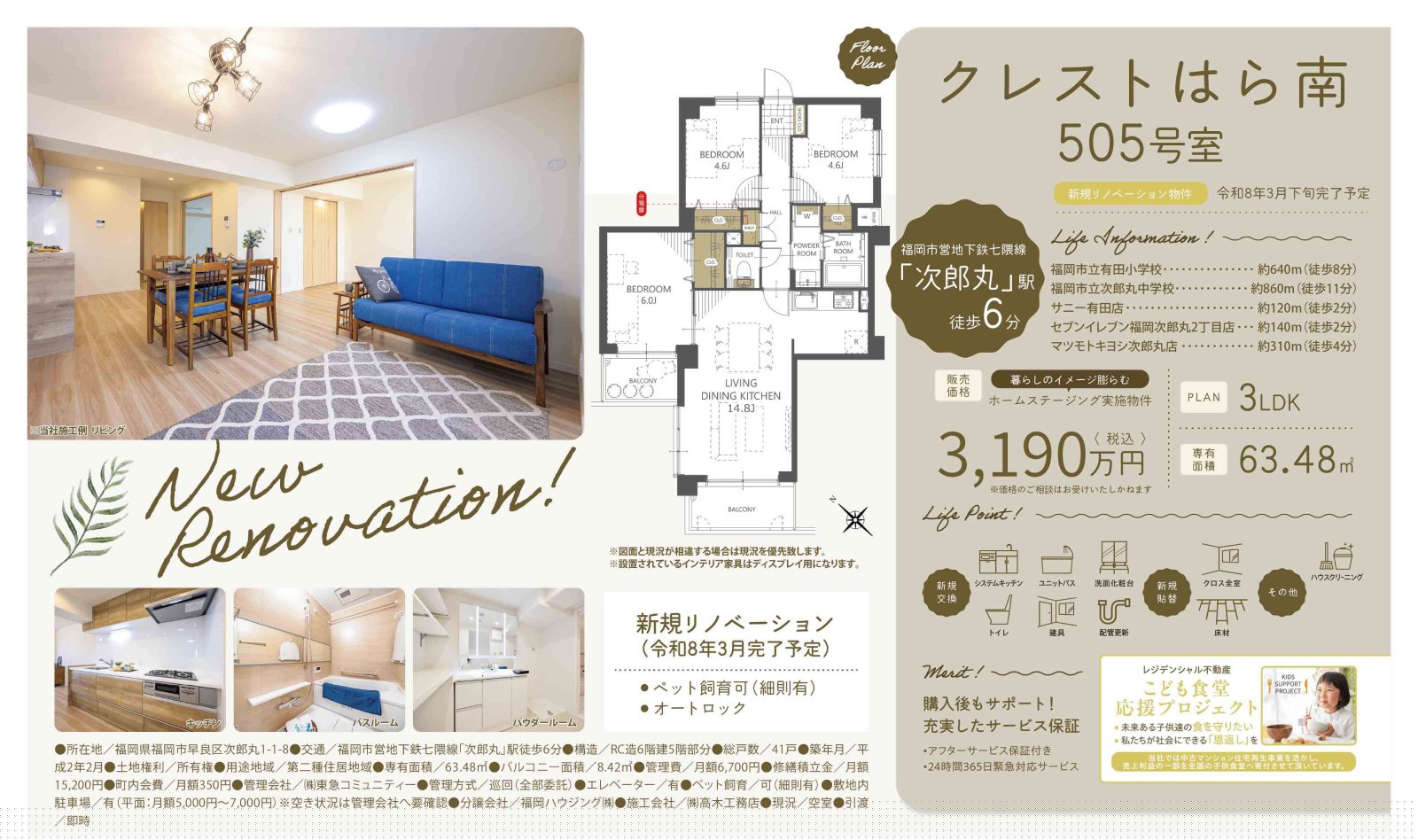 有田小・次郎丸中エリア☆ 令和8年3月フルリフォーム完了予定☆ 地下鉄七隈線「次郎丸」駅まで徒歩圏内♪ 通勤通学に便利な好立地☆ 物件周辺には、コンビニ・スーパー・銀行もあり 日々の生活にも便利な好立地です! ペット飼育可☆【規約の範囲内】 大切なペットと新生活を♪